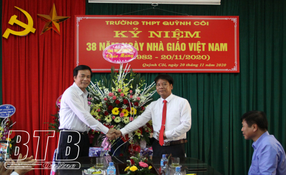 Đồng chí Nguyễn Hạnh Phúc, Ủy viên Ban Chấp hành Trung ương Đảng, Tổng Thư ký, Chủ nhiệm Văn phòng Quốc hội chúc mừng Trường THPT Quỳnh Côi nhân ngày Nhà giáo Việt Nam