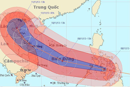 Theo tin của Trung tâm dự báo Khí tượng Thủy văn Trung ương: Hồi 07 giờ ngày 08/11, vị trí tâm bão HAIYAN ở vào khoảng 11,0 độ Vĩ Bắc; 124,8 độ Kinh Đông....