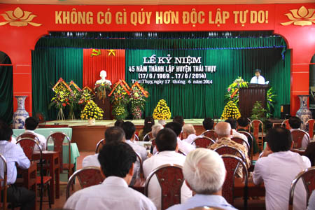 Sáng ngày 17/6, huyện Thái Thụy tổ chức kỷ niệm 45 năm ngày thành lập (17/6/1969 - 17/6/2014). Ðến dự có các đồng chí: Phạm Văn Ca, Ủy viên Ban Thường vụ...