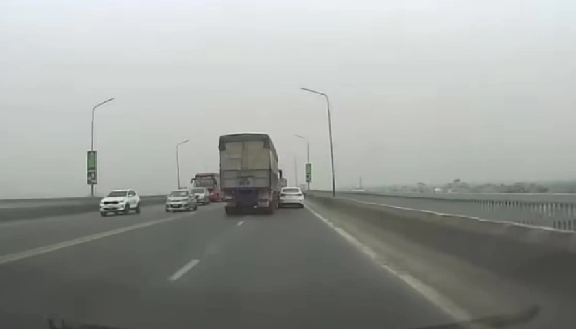 Đi song song trên cầu, xe con bị xe tải chuyển làn ép sát vào thành cầu tại cầu Thăng Long.