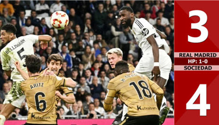 Bàn thắng Real Madrid vs Sociedad: Ở trận đấu giữa Real Madrid vs Sociedad tại bán kết lượt về cúp Nhà vua, đội chủ nhà đã để thua với tỷ số 3-4. Hòa 4-4...