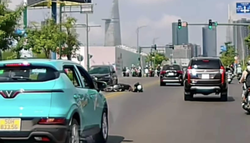 TP HCM - Bất ngờ đi chéo trước đầu ôtô để rẽ trái, người phụ nữ đi xe máy bị đâm ngã lăn ra giữa đường tại Tố Hữu, Thủ Đức.