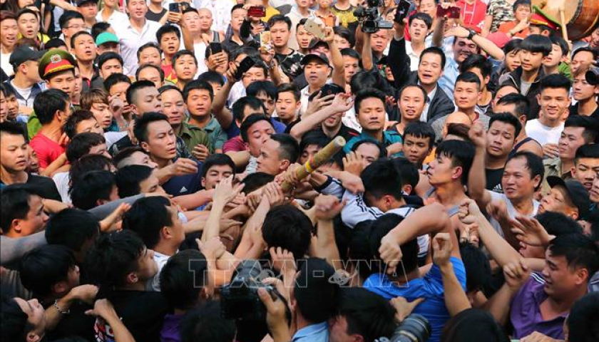 Hàng nghìn thanh niên hò reo, xô đẩy nhau trong cảnh hỗn loạn, quyết giành giật lấy cây bông nhằm cầu may tại lễ hội ở huyện Hoài Đức (Hà Nội), chiều 6/2...