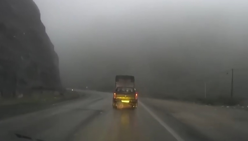 Sau khi xin vượt tại khúc cua dốc, đường trơn, một chiếc xe bán tải đã mất kiểm soát và húc thẳng vào hông xe tải chở hàng.
