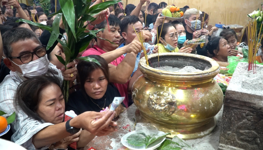Người dân từ nhiều nơi đổ về chùa Bà Thiên Hậu thắp nhang, xin tro để cầu an, may mắn, từ đêm 14 đến sáng ngày rằm tháng Giêng.