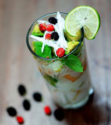 Cho hoa quả đã sơ chế vào cốc, thêm 3 thìa sữa tươi không đường, 2 thìa cà phê sữa đặc, 2 thìa cà phê nước cốt dừa, ½ hộp sữa chua, vài giọt nước cốt...