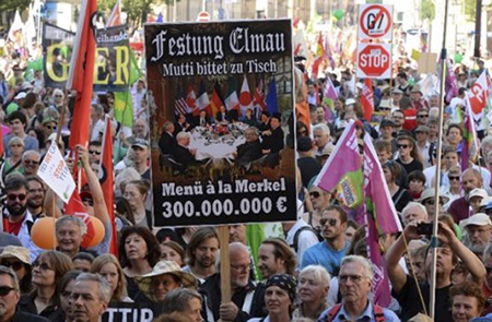Một trong số những yêu cầu của người biểu tình là các nhà lãnh đạo G7 hủy kế hoạch thỏa thuận TTIP giữa châu Âu và Mỹ.