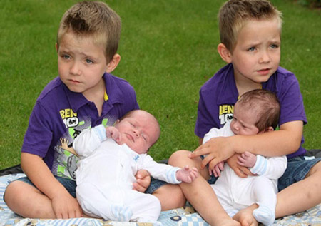 Một bà mẹ ở Anh không dám tin vào sự thật khi hai cặp con trai sinh đôi của chị được sinh cùng ngày tháng và cách nhau tròn 4 năm.