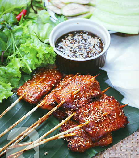 Bánh ướt thịt nướng với phần thịt mềm ngọt, đậm đà ăn kèm với dưa chuột, chuối xanh, rau sống và bánh ướt quả thực ngon không tả được.
