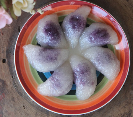 Bánh bột lọc khoai lang thơm phức mùi cốt dừa quyện với vị ngọt bùi của khoai lang tím, màu sắc thì vô cùng bắt mắt.