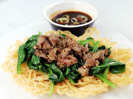 Phở chiên giòn rụm, mồng tơi xanh ngắt, thêm những lát thịt bò thơm lựng cùng ngân nga lời ru ngọt ngào trong vòm họng, lời ru của những khúc biến...