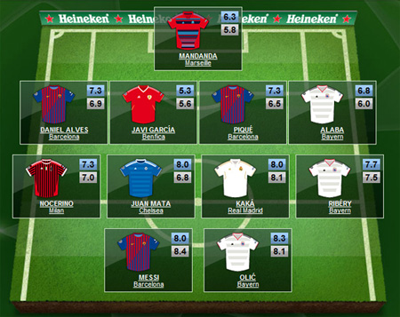 Barca và Bayern Munich mỗi đội đóng góp 3 vị trí trong khi Chelsea, Real hay AC Milan chỉ có một gương mặt. Đội hình do UEFA bình chọn