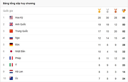 Tính đến thời điểm hiện tại (7h30 ngày 18/8, theo giờ Việt Nam), đoàn thể thao Mỹ vẫn đang dẫn đầu bảng tổng sắp với 86 huy chương (28 HCV, 30 HCB và 28...