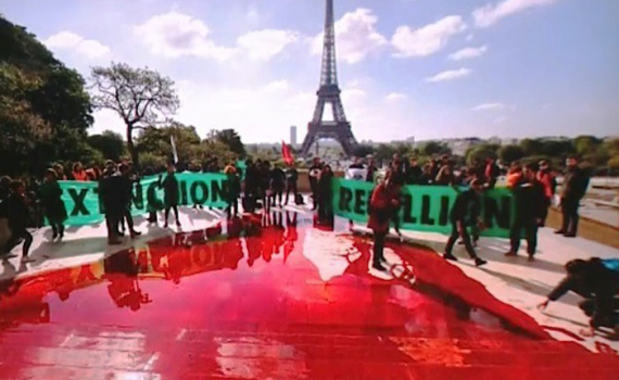 300 trăm lít máu giả được làm từ màu thực phẩm và bột ngô được đổ ra các bậc cầu thang ở chân tháp Eiffel để phản đối tình trạng ô nhiễm môi trường.