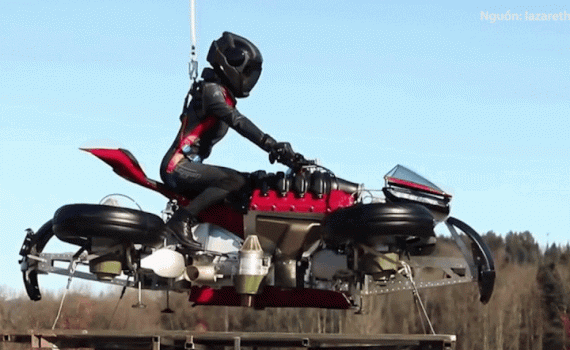 Sử dụng bộ truyền động thủy lực nâng 4 bánh sang ngang và hệ thống tuabin phản lực giúp môtô có thể chạy dưới đường hoặc bay trên không trung.