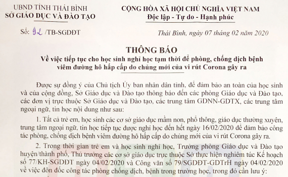 Học sinh Thái Bình tiếp tục được nghỉ học đến ngày 16/2 để phòng, chống dịch bệnh
