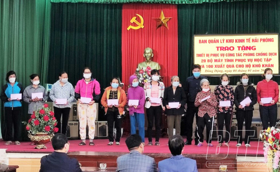 Xã Đông Động (Đông Hưng) đã tổ chức tiếp nhận thiết bị hỗ trợ phục vụ công tác phòng, chống dịch Covid-19, máy tính phục vụ học tập và trao quà cho hộ khó...