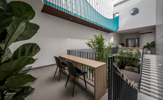 Tại sảnh tầng hai, một cây cầu bằng thép được nối từ bên trong ra ngoài làm nơi hóng gió, tạo điểm nhấn cho ngôi nhà.