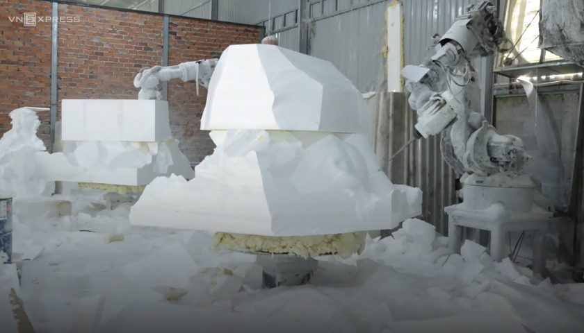 Một xưởng ở phường Phước Long, Thủ Đức, thành phố Hồ Chí Minh, dùng 6 "cánh tay robot" điêu khắc các mô hình linh vật rồng khổng lồ để phục vụ dịp Tết...