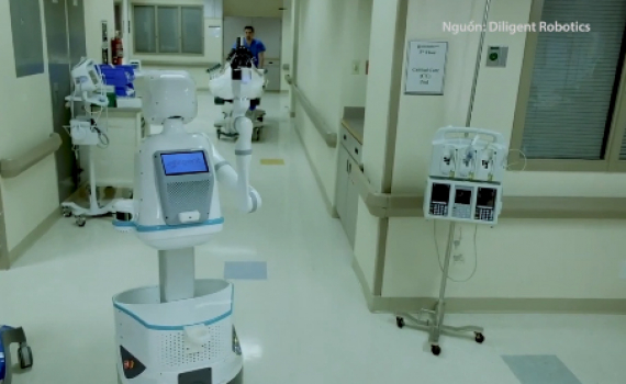 Robot có tên gọi Moxi được tích hợp AI có nhiệm vụ hỗ trợ điều dưỡng trong bệnh viện như thu thập vật tư, đưa thuốc, giao mẫu xét nghiệm...giúp các bác...
