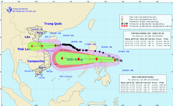 Hồi 01 giờ ngày 26/10, vị trí tâm bão Molave ở khoảng 13,5 độ Vĩ Bắc; 122,2 độ Kinh Đông, trên khu vực miền Trung Phi-líp-pin.