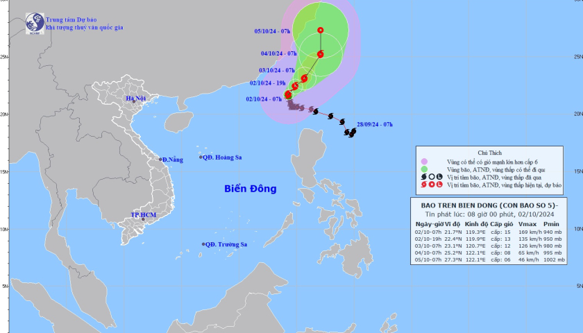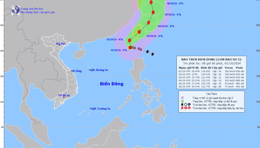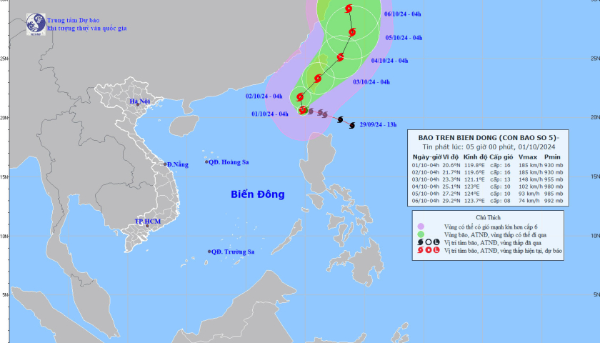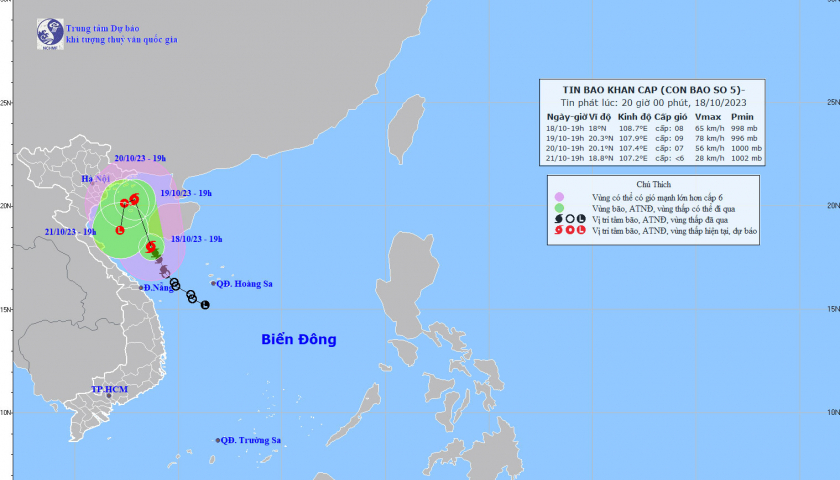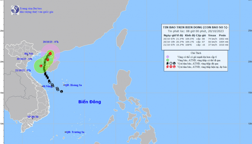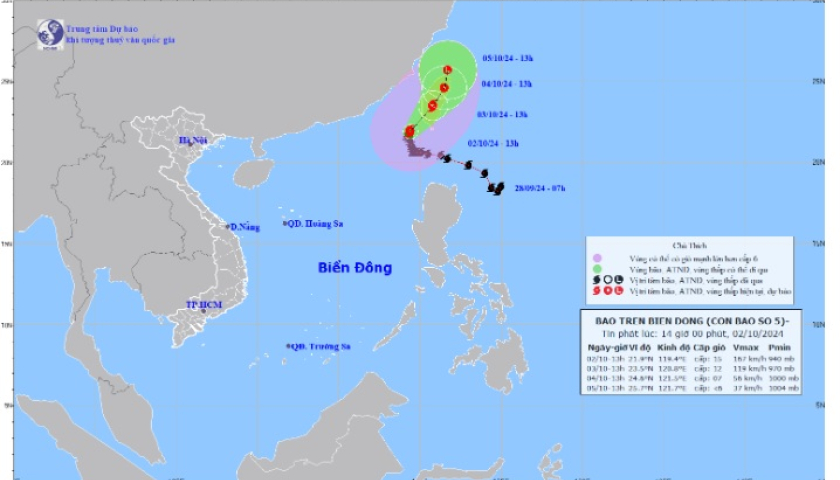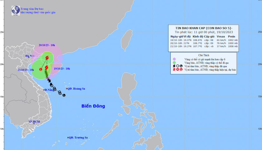 Theo Trung tâm Dự báo khí tượng thủy văn Quốc gia, bão số 5 đang di chuyển chậm theo hướng Bắc Đông Bắc với tốc độ khoảng 5 km/h.