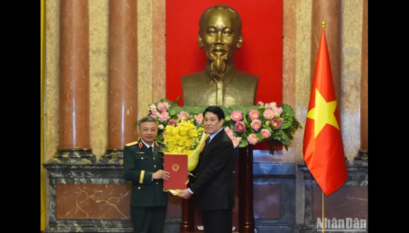 Chủ tịch nước Lương Cường trao quyết định thăng quân hàm Thượng tướng cho đồng chí Lê Quang Minh