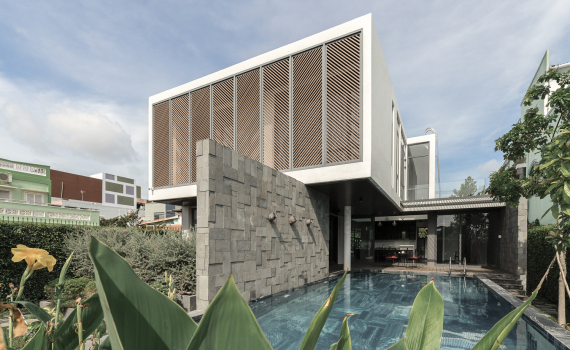 Nhờ thiết kế một lớp kính phía trong và lớp cửa gỗ bên ngoài, căn biệt thự luôn tràn ngập ánh nắng và gió.