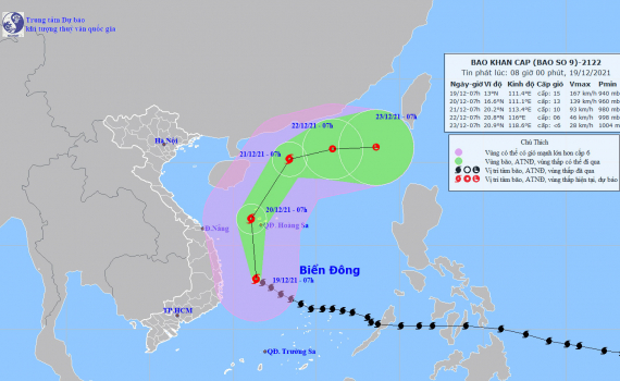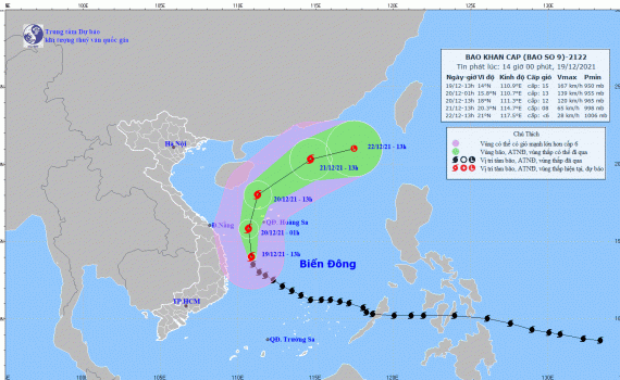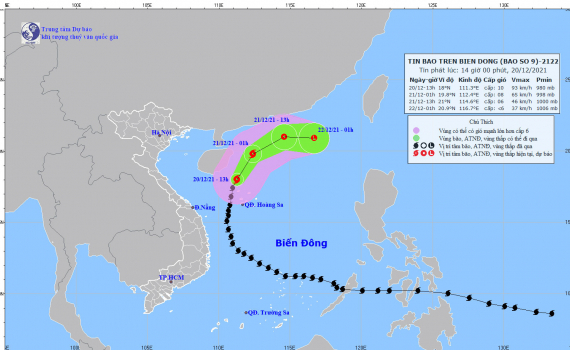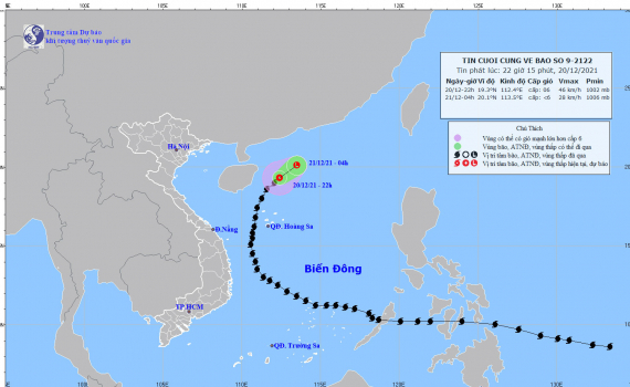 Hồi 19 giờ ngày 20/12, vị trí tâm bão ở khoảng 19,0 độ Vĩ Bắc; 112,1 độ Kinh Đông, cách đảo Hoàng Sa khoảng 290km về phía Bắc. Sức gió mạnh nhất vùng gần...