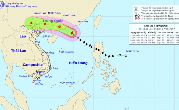 Hiện nay, bão số 7 vẫn đang giữ cường độ mạnh cấp 10. Lúc 4h sáng nay (27/8), tâm bão cách bờ biển tỉnh Quảng Đông (Trung Quốc) 230km về phía Đông...
