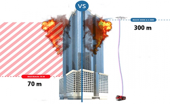 Thiết bị được điều khiển từ xa, chạy bằng điện, có thể tiếp cận đám cháy ở độ cao 300 m và nâng vật nặng tối đa 200 kg.