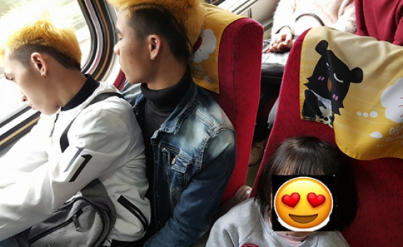 Bức ảnh chụp hai thanh niên người Việt ngồi chung ghế để nhường chỗ cho các em bé trên một chuyến tàu đang lan truyền trên mạng Đài Loan.