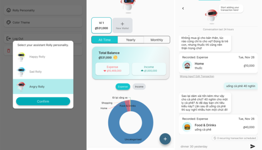 Ứng dụng quản lý tài chính Rolly cho phép nhập thông tin thu chi qua chat bằng tiếng Việt và nghe AI nhận xét về khoản chi đó.