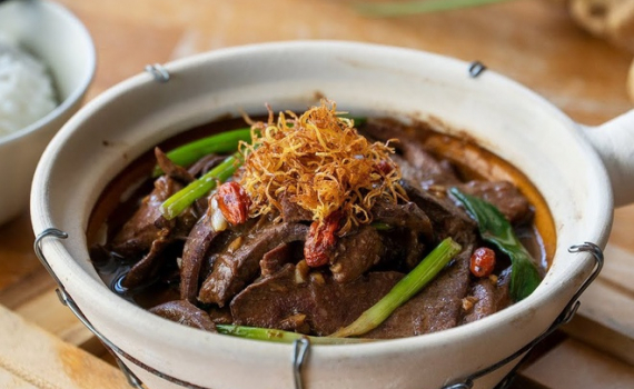 Gan heo được làm sạch với bột mì sau đó đem chế biến với gừng, kỷ tử mang lại cho bạn món ăn không chỉ đẹp mắt, hương vị bên trong cũng rất hấp dẫn.
