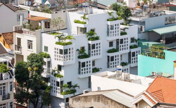 Nhìn từ ngoài, căn nhà giống như ba khối hộp xếp chồng lên nhau, hình bậc thang tạo ra các ban công lớn kết hợp với cây xanh giúp hình thành không gian...