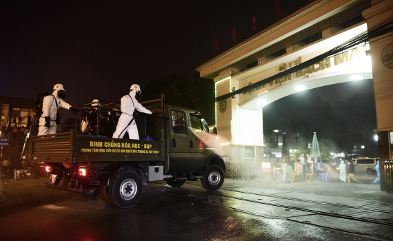 Tối 28/3, Binh chủng Hóa học (Bộ Quốc phòng) phun khử khuẩn toàn bộ Bệnh viện Bạch Mai.