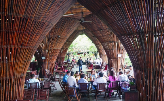 Quán được thiết kế với những cụm tre giống nơm úp cá, từng vào top 5 công trình kiến trúc đẹp nhất năm 2014.