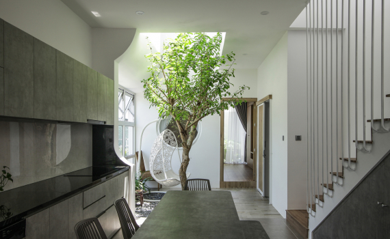 Khe lấy gió ở mặt tiền hút khí vào bên trong, kết hợp với luồng khí của hai giếng trời giúp bản thân căn nhà tự điều hòa không khí.
