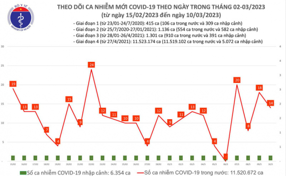 Ngày 10/3, báo cáo của Bộ Y tế cho biết có 14 ca mắc COVID-19 mới, giảm nhẹ so với hôm qua.