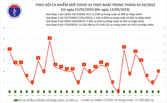 Bản tin phòng chống dịch COVID-19 tại Việt Nam ngày 13/3 của Bộ Y tế cho biết, có 9 ca mắc mới, tăng gấp hơn 2 lần ngày trước đó. Hôm nay có 1 bệnh nhân...