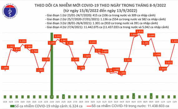 Theo Bản tin Bộ Y tế về tình hình chống dịch COVID-19, ngày 13/9, ghi nhận 3.301 ca mắc COVID-19 mới; có 11.167 bệnh nhân được công bố khỏi bệnh.