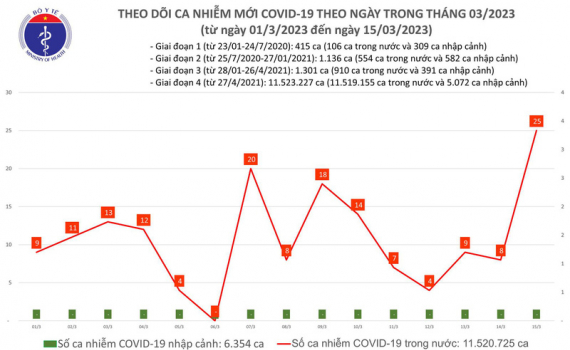 Theo Bản tin Bộ Y tế về tình hình chống dịch COVID-19, ngày 15/3, ghi nhận 25 ca mắc COVID-19 mới; có 6 bệnh nhân được công bố khỏi bệnh.