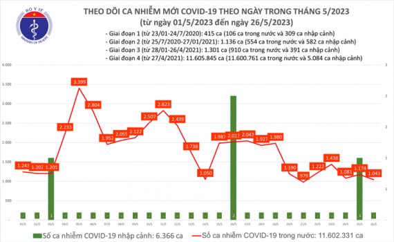 Ngày 26/5, bản tin phòng, chống dịch Covid-19 của Bộ Y tế cho biết số ca mắc Covid-19 mới giảm còn 1.043 ca.