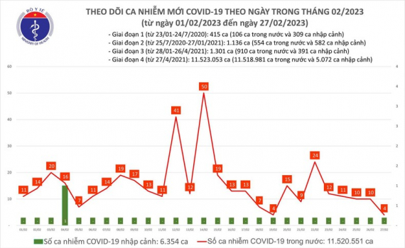 Ngày 27/2, bản tin phòng, chống dịch Covid-19 của Bộ Y tế cho biết, cả nước ghi nhận 4 ca mắc mới Covid-19, giảm nhẹ so với hôm qua.
