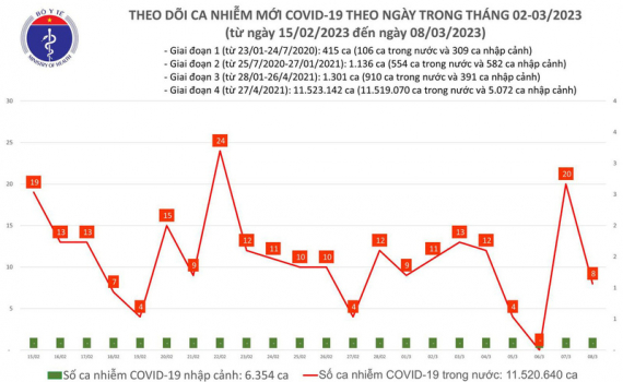 Theo Bản tin Bộ Y tế về tình hình chống dịch COVID-19, ngày 8/3, ghi nhận 8 ca mắc COVID-19 mới; có 5 bệnh nhân được công bố khỏi bệnh.