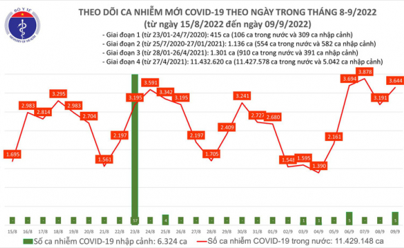 Theo Bản tin Bộ Y tế về tình hình chống dịch COVID-19, ngày 9/9, ghi nhận 3.644 ca mắc COVID-19 mới; có 17.576 bệnh nhân được công bố khỏi bệnh.