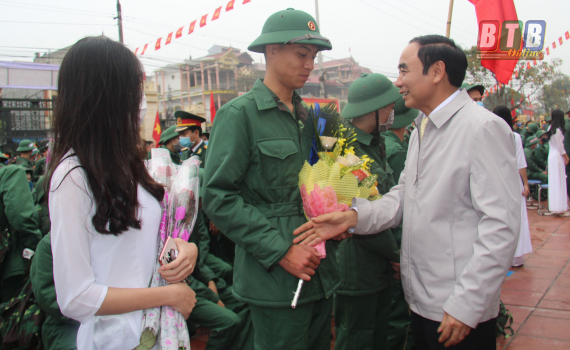 Thứ trưởng Bộ Công an Lương Tam Quang và đồng chí Bí thư Tỉnh ủy dự lễ giao, nhận quân tại huyện Quỳnh Phụ