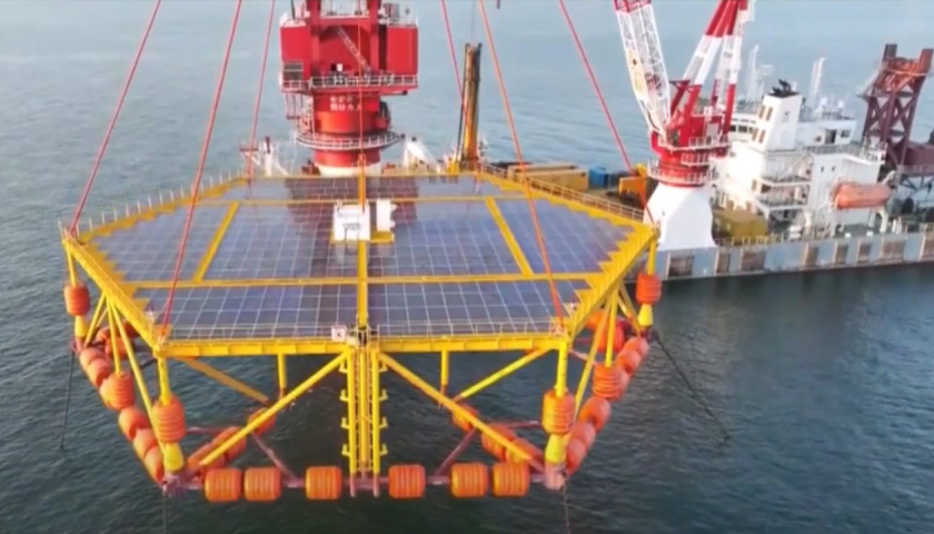 Bệ pin mặt trời nổi có hình lục giác, trang bị 343 tấm pin mặt trời và có thể đứng vững khi biển động.
