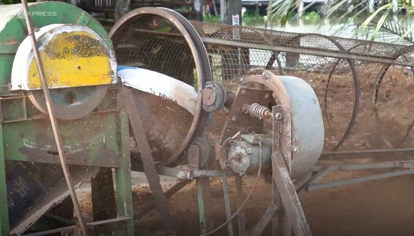 Tận dụng sắt vụn bỏ đi, anh Nguyễn Tấn Kỷ, 39 tuổi (Kiên Giang) chế máy nghiền vỏ dừa khô để làm phân bón cho cây, giúp giảm ô nhiễm môi trường.