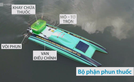 Hai học sinh lớp 9 ở Hậu Giang sáng chế thuyền phun thuốc chữa bệnh cho cá, thiết bị được điều khiển từ xa, giúp tiết kiệm thời gian, chi phí.